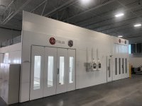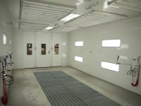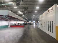 (Below) A Kayco custom Medallion downdraft booth 30' X 14'X 9' is extra long to accommodate trucks. The waterborne drying apparatus was provided by the owner's paint supplier.