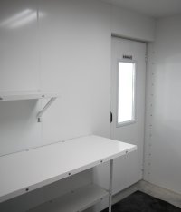 (Below) A narrow lot and building required space-saving measures, such as sharing a door between the mix room and booth.