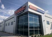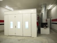 An outside shot of the booth showing the Absoluteaire heated air make-up system with generously sized ducts, along with the dry chem fire suppression system. |