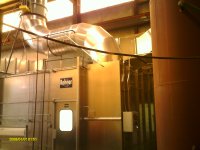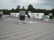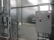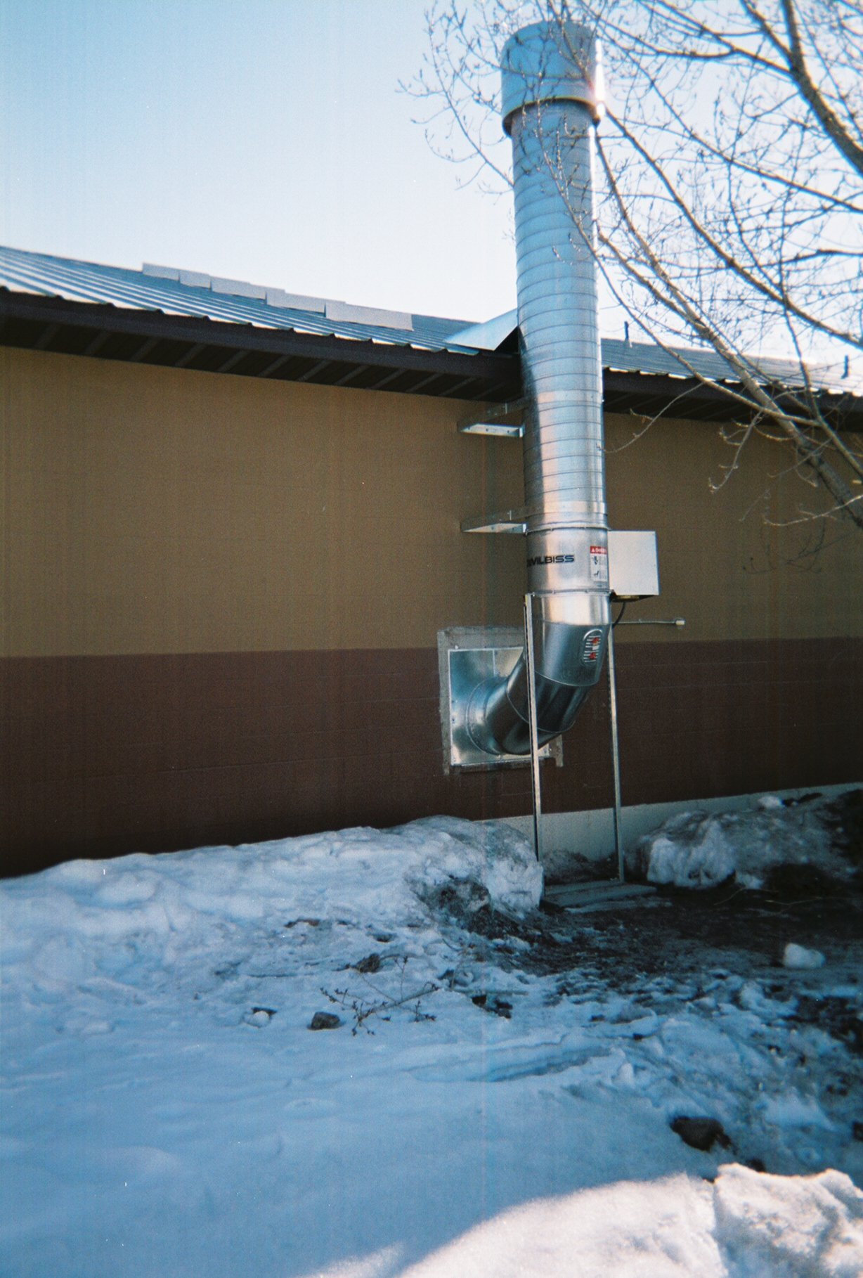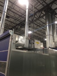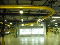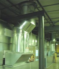 Mounted in the ceiling are two of three installed Thermo Mixers, which are not heaters. These determine how much outside air (up to 10,000 CFM each) is brought in and mixed with the building's warm air to replace exhausted air. In combination with Thermo-Cyclers, this system saves the end user up to 50% of the energy that would be consumed by using traditional methods of heating and air turnover. |