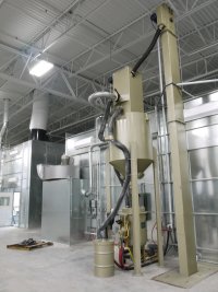 (Below) From the trench in the booth, used media travels along an in-floor conveyor to the Clemco media recovery system, which incorporates a bucket elevator and cyclonic media separator.