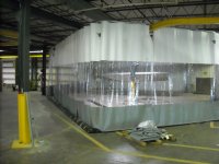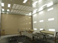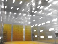 Painting big equipment requires a big paint booth, in this case a Rohner unit 60'L x 28'W x 28'H, pictured above with its exhaust plenum and filters. Some 80 T-8 energy efficient flourescent fixtures were needed to light the booth.