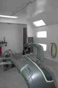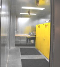 Other items visible in the above photo enlargement are generous lighting, neoprene lining to the 7-foot level, the grated in-floor recovery trench, and personal safety equipment, including fresh air breathing hood and air conditioned suit.