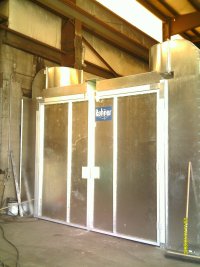 (Above) Refurbished in 2005, this is a 15-year-old DeVilbiss car paint booth, with generous new lighting added. (Below) Notice the plenum of the "booster" heater mounted on top of the booth. See where the plenum connets with the custom door scoops to direct superheated air into the booth.  |