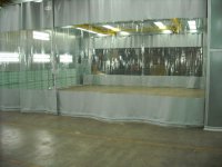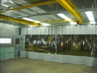 (Right) A used Spray Systems booth 16'H x 25'W x 49'L features Goff's curtain walls on the front and one side for flexibility and ease of moving materials in and out of the spray area. The twin ducts exhaust filtered air from two fans.