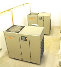 (Above) More energy savings are achieved in the compressor room, with two Mattei rotary vane compressors--a 40 HP AC30, plus an auxiliary 40 HP Optima 30 with variable output.