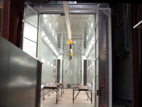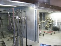 The middle booth is a new Kayco downdraft booth with a new Spray Tech mix room behind it that provides access to all three booths. The Mercury air make-up on top of this booth actually heats the 60' X 16' X 18' Spray Tech booth on the right. That booth is surrounded by a steel cage that supports the I beam hanging the length of the ceiling inside the booth.