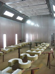 (Below) Items to be painted go directly from the blast booth to the well-lit Sprayline paint booth. An oversized paint mix room accommodates large drums of paint.