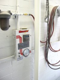 (Above) Roof-mounted ductwork for the Spraytech/Mercury air make-up system. Equipment manufactured by four companies was used to customize this challenging but very functional installation. (Below) The control panel with variable frequency drive provides energy efficiency and gives the operator complete control of paint dry times and booth pressure.